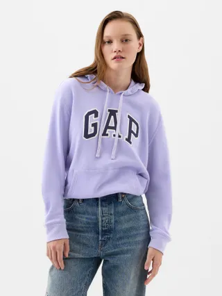Bluza damska GAP z kapturem zakładana przez głowę w kolorze liliowym. Kieszeń typu kangur. Z podszyciem French Terry - to cieńszy materiał dresowy mający inny styl dziania oraz wyraźny splot w postaci pętli z drugiej wewnętrznej strony.
