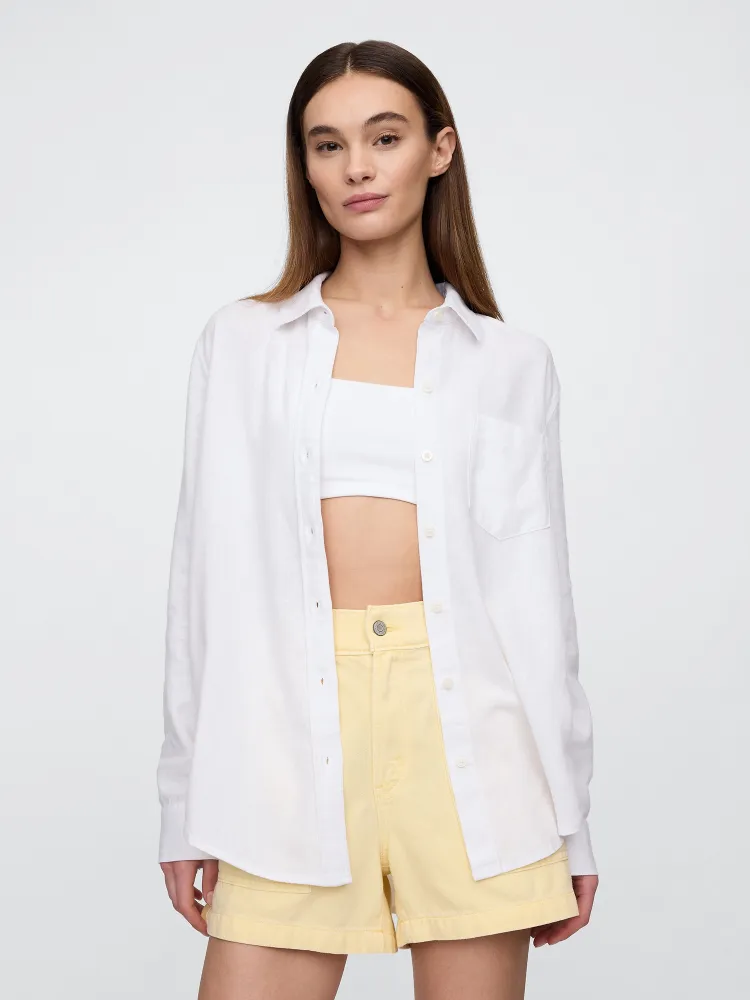 Koszula z mieszanki lnu to stylowy wybór na co dzień. Długie rękawy z mankietem zapinanym na guziki, tak jak cała długość koszuli, kieszeń na piersi to miły detal. Zaokrąglony dół z lekko wydłużonym tyłem pozwala nosić koszulę zarówno wpuszczoną w spodnie, jak i lużno. Wygodna i uniwersalna, idealna do wszystkich stylizacji.