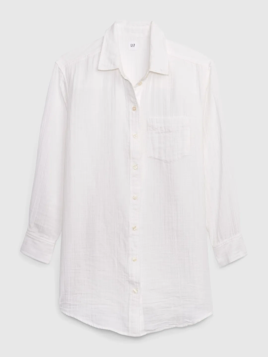 GAP damska koszula z muślinu. Lekka i zwiewna. Długa - może służyć jako oddzielna część garderoby, lub w zestawie ze spodniami lub spódnicą. Super materiał przyjazny dla skóry i środowiska. Produkty GAP są gwarancją jakości i precyzyjnego wykonania.