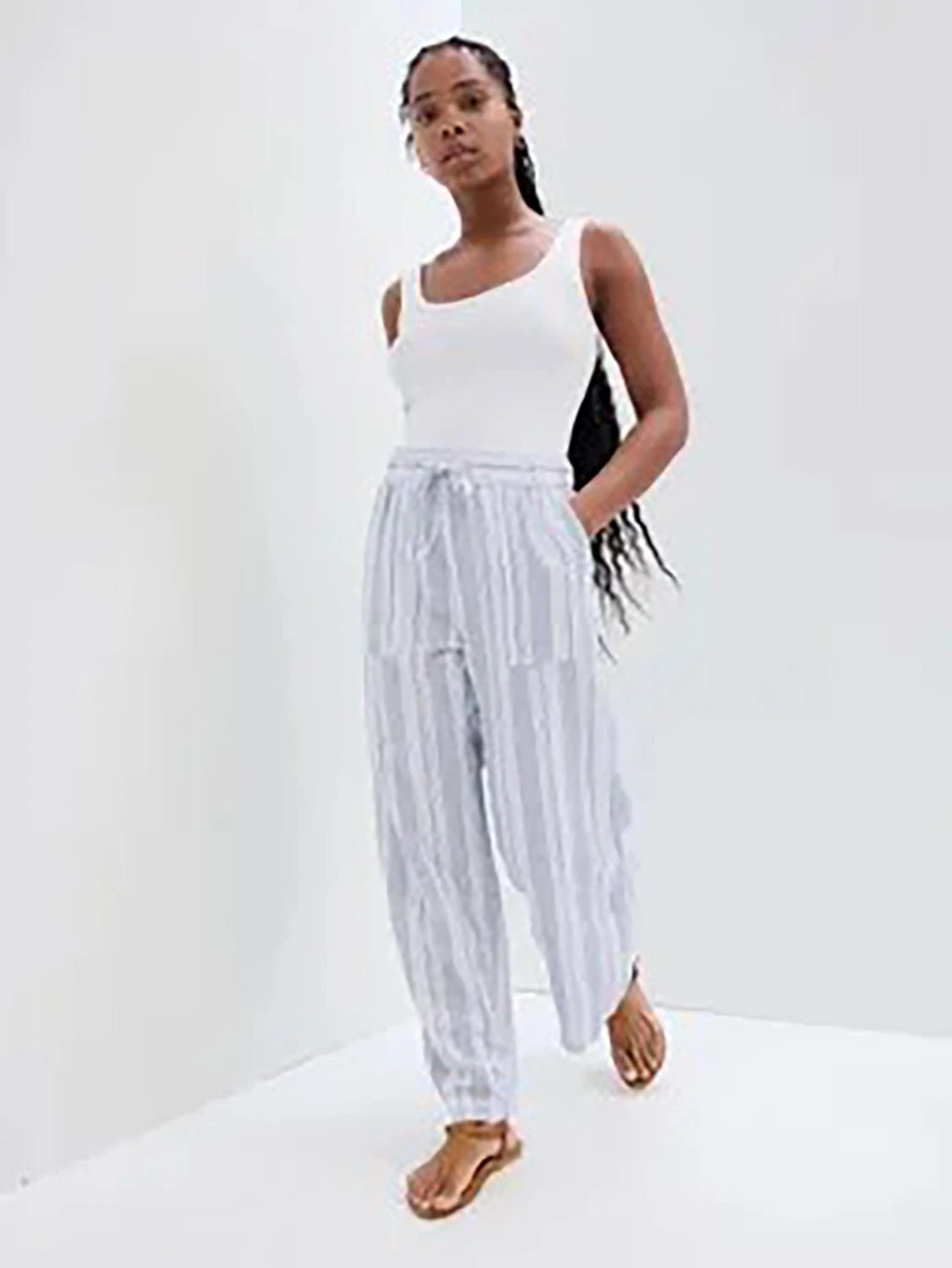 GAP szerokie spodnie damskie w drobne paski.Szerokie,lużne spodnie o modnym kroju.Elastyczny pas ze sznurkiem,przednie ukośne kieszenie,a z tyłu płaskie naszywane.Produkty GAP charakteryzuja się doskonałą jakością i precyzyjnym wykonaniem.