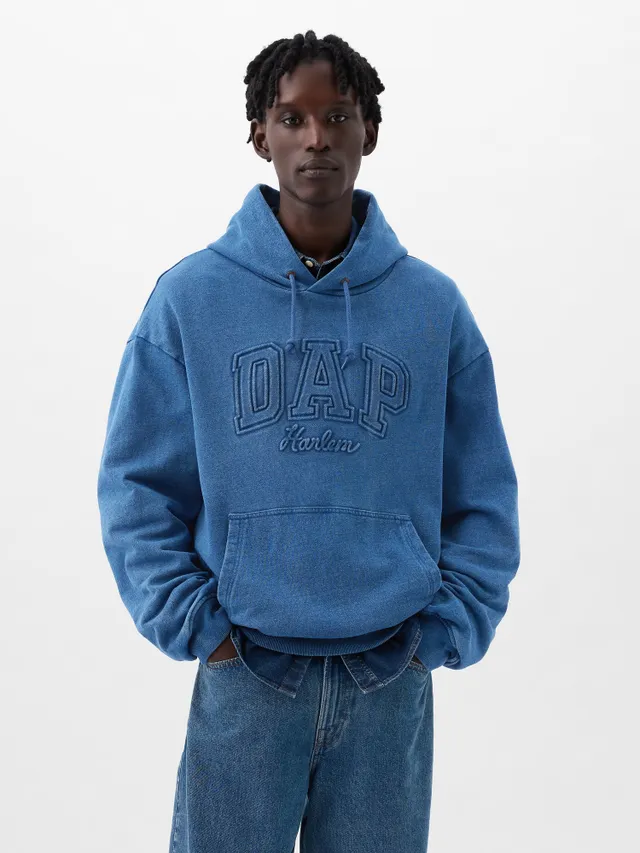 Bluza męska niebieska z Kolekcji GAP x Dapper Dan Unisex, zakładana przez głowę, kaptur i kieszeń kangurka. Luźniejszy, prosty krój. Dapper Dan (DAP) projektant, mistrz krawiectwa z Harlemu. Kolekcja subtelnie łączy kultowe bluzy i dżinsy GAP, odzwierciedlając kulturę Harlemu.
