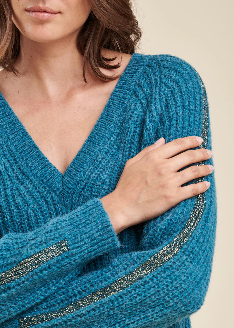 Niebieski sweter marki LA FEE MARABOUTEE z raglanowymi rękawami, dekoltem w kształcie litery V, wzdłuż rękawów ozdobny pas z lureksu. Luźny fason zapewni dobre samopoczucie, elegancję i naturalność. Wyprodukowany z dzianiny z dodatkiem mohairu znanego ze swojego jedwabistego połysku i naturalnego ciepła. Kolekcje firmy La Fee Maraboutee powstają z zamiłowania do podróży, mieszania kultur i spotkań z klientami. Marka ceni typy sylwetek i oferuje styl dla każdej kobiecości. Jej kolekcje wolne od utrwalonych stylów i nieustannych trendów są dostępne w naturalnych i ciepłych kolorach. La Fee Maraboutee tworzy ponadczasową garderobę szanując wartości etyczne na wszystkich etapach produkcji.