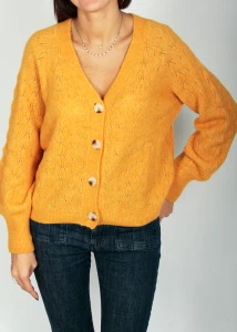 Kardigan marki Lauren Vidal zapinany z przodu na guziki w kolorze mandarynki z lekko bufiastymi rękawami zakończonymi szerokim mankietem to postawa stylowego looku. Mohair to cenne naturalne włókno pochodzące z wełny kozy angorskiej. Delikatny blask włókien mohairu to połączenie elegancji i ponadczasowości. Lauren Vidal to ekskluzywna marka i renomowany producent oryginalnej damskiej odzieży, charakteryzującej się najmodniejszą stylizacją i doskonałą jakością wykonania. Odzież francuska tej marki to odważna i bardzo kobieca propozycja do codziennych stylizacji z odpowiednim poziomem uniwersalności. Lauren Vidal potrafi spełnić rosnące oczekiwania najbardziej wymagających klientek. Ten kardigan w delikatny ażurowy wzór jest czymś więcej niż tylko dzianiną, to uczucie lekkości i luksusu na co dzień w poczuciu kobiecej elegancji.