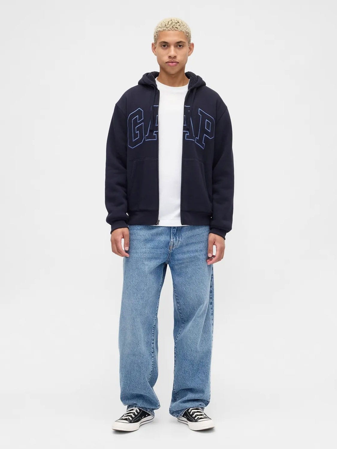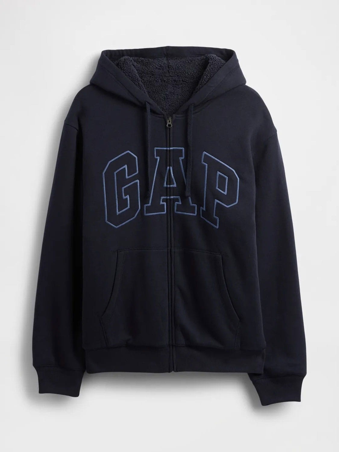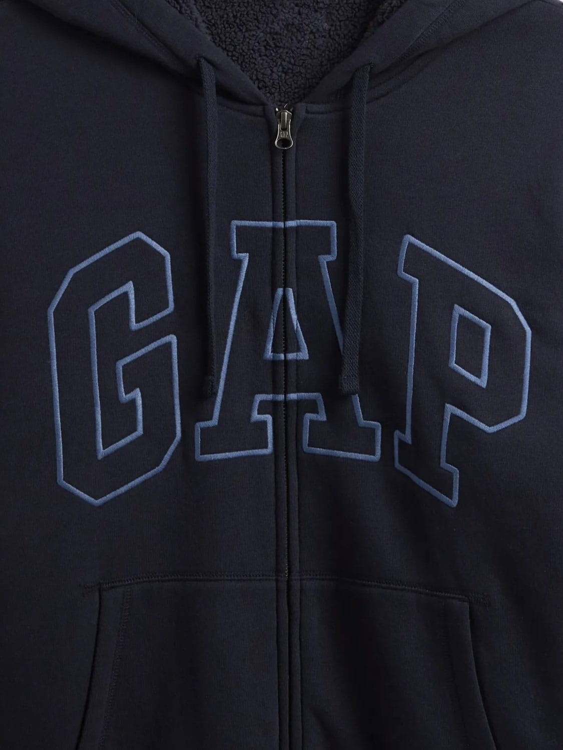 Wnętrze bluzy, włącznie z kapturem, jest w całości wykończone podszewką z sherpy, co gwarantuje maksymalne ciepło. Bluza posiada kaptur ze sznurkami do regulacji, praktyczne zapięcie na suwak, opadające ramiona oraz długie rękawy z prążkowanymi mankietami. Dwie kieszenie z przodu i duże, naszywane logo Gap na piersi dopełniają jej klasyczny wygląd. Prosty, luźniejszy krój sprawia, że jest idealna do noszenia warstwowego lub jako samodzielna odzież wierzchnia.