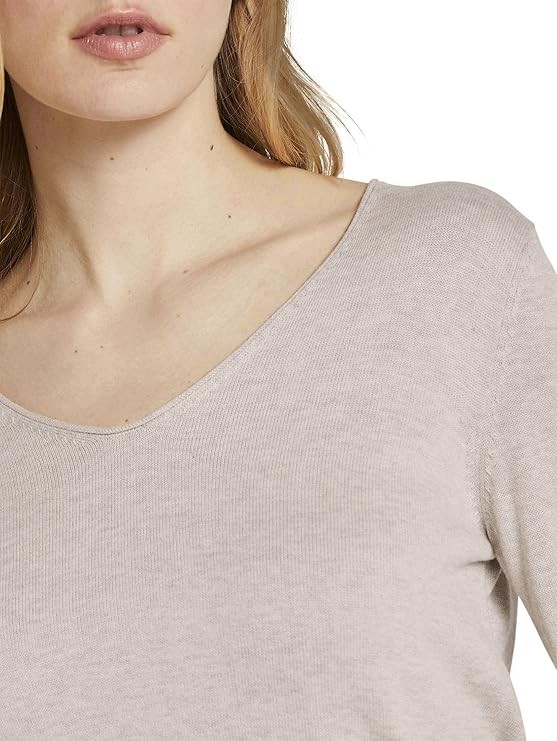Sweter damski w kolorze jasnobeżowym TOM TAILOR zakładany przez głowę, z dekoltem w serek, z lekko zwiniętymi krawędziami obszycia. Wykonany z miękkiej dzianiny, 60% bawełny i 40 % wiskozy. Optymalne dopasowanie, wysoki standard noszenia, do stylizacji przez cały rok. TOM TAILOR to międzynarodowa marka niemieckiego projektanta.
