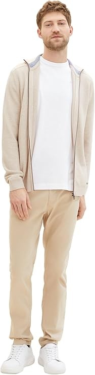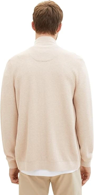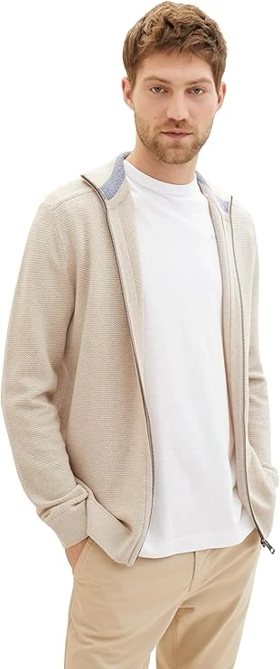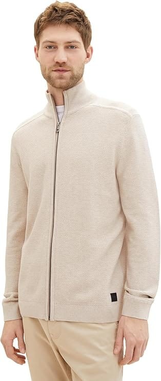 Kardigan męski TOM TAILOR w kolorze jasnego beżu, zapinany na suwak ze stójką. Optymalne dopasowanie, wysoki standard noszenia. Wykonany w 100% z bawełny, można prać w pralce. TOM TAILOR to międzynarodowa marka niemieckiego projektanta.