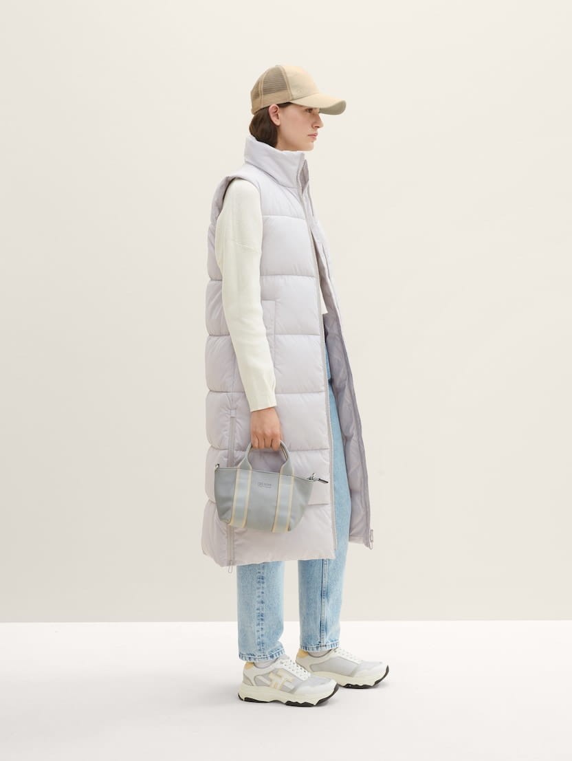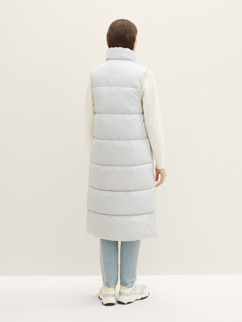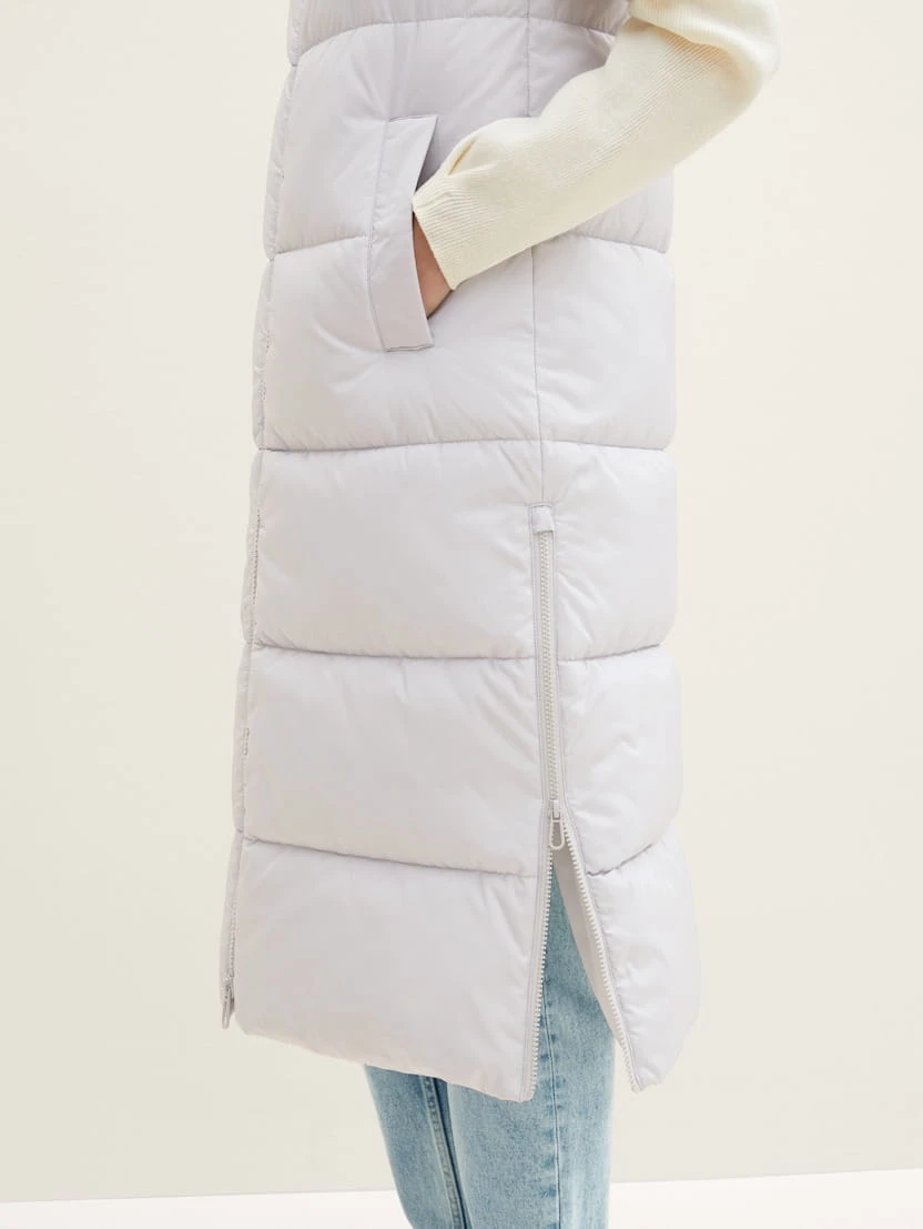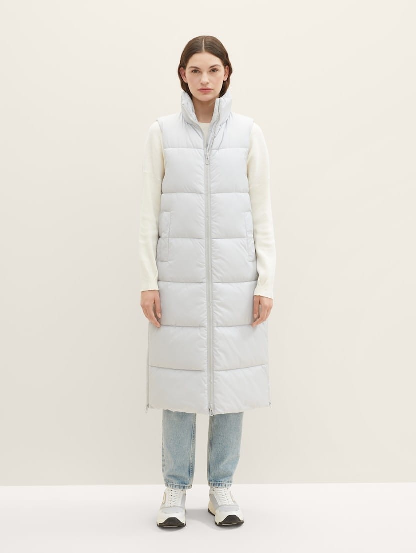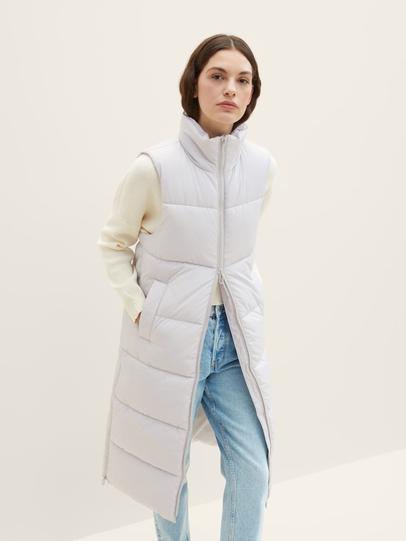 TOM TAILOR kamizelka damska jasnoszara. Bardzo długa, bardzo ciepła, chroniąca przed wiatrem, deszczem i chłodem. Dwustronnie zapinany suwak pomaga regulować temperaturę. Boczne kieszenie zapinane na zatrzaski, wysoka stójka, oraz suwaki od dołu kamizelki.