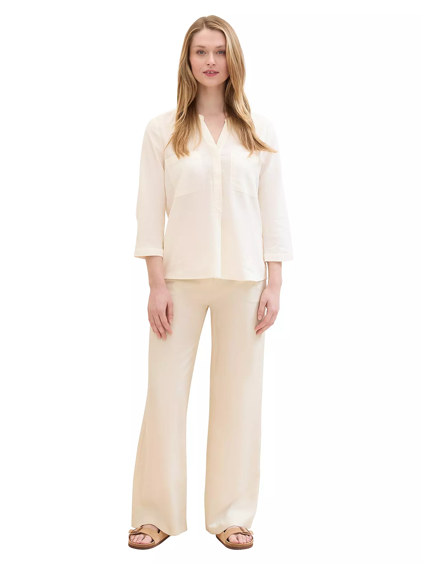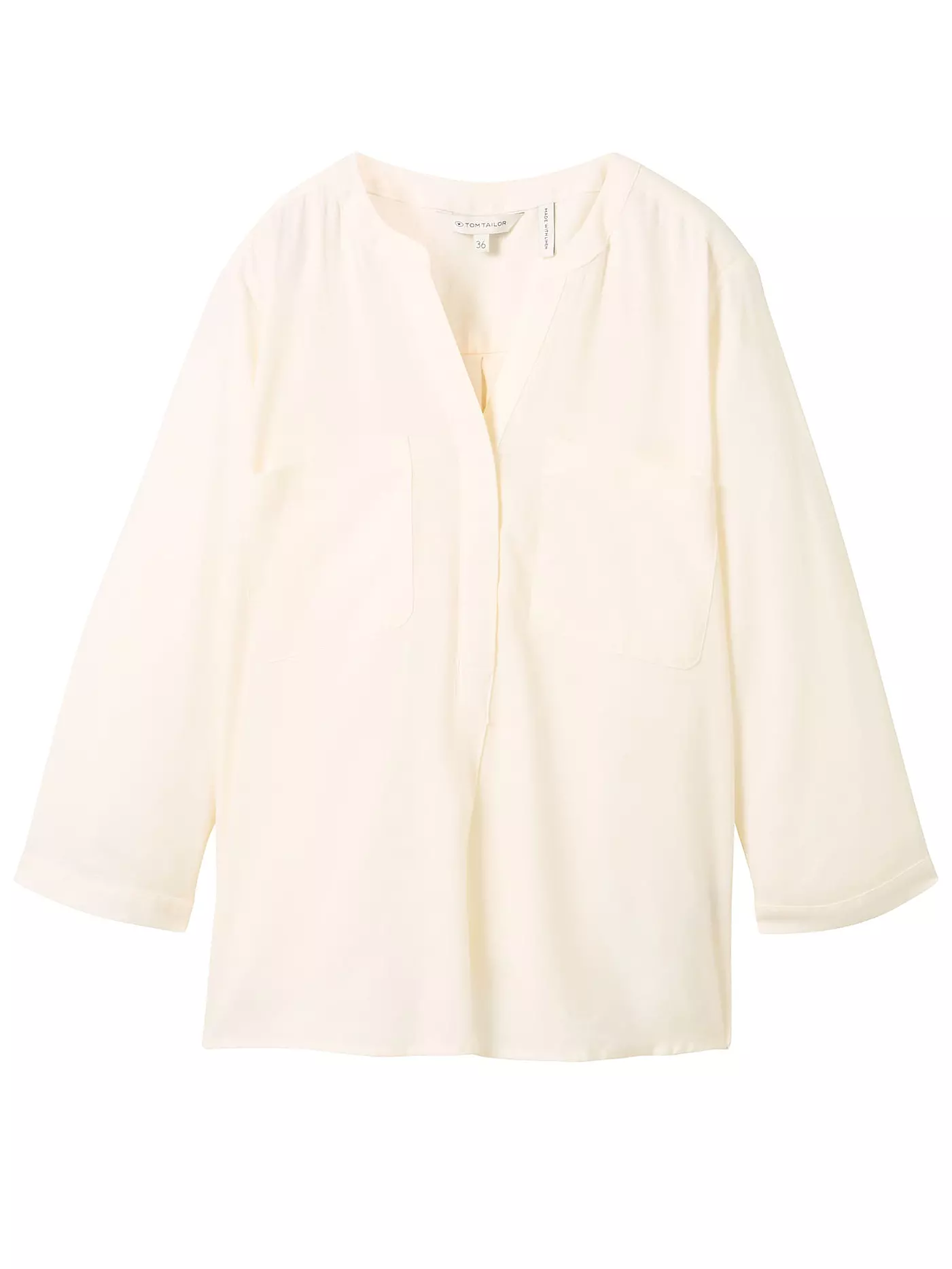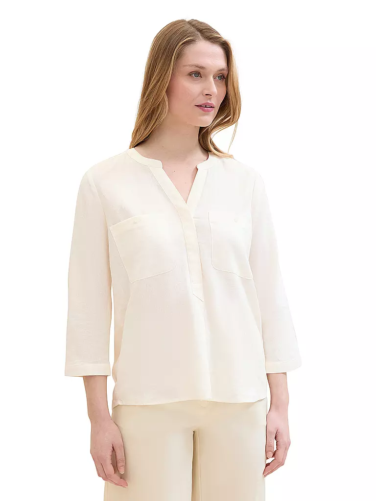Lniana koszula damska TOM TAILOR biała, dekolt w serek, rękawy 3/4 zapinane na guzik z kieszeniami na piersi to doskonały dodatek do letniej kolekcji każdej kobiety, ponieważ jest zarówno praktyczna, jak i szykowna. Optymalne dopasowanie i wysoki komfort noszenia. Tom Tailor to międzynarodowa firma niemieckiego projektanta.