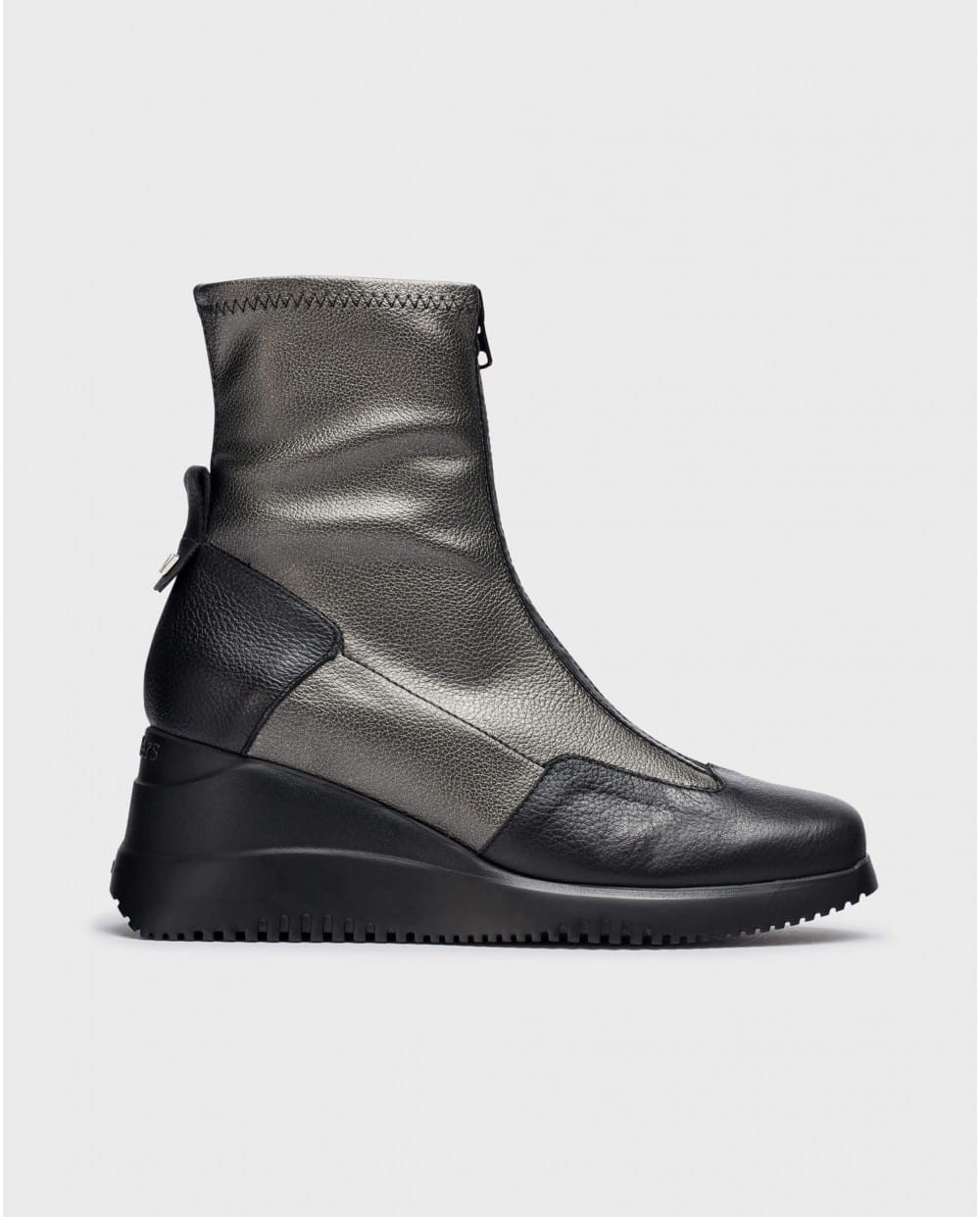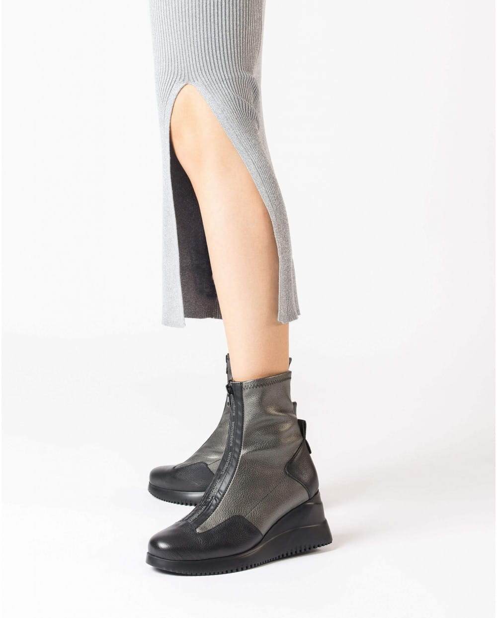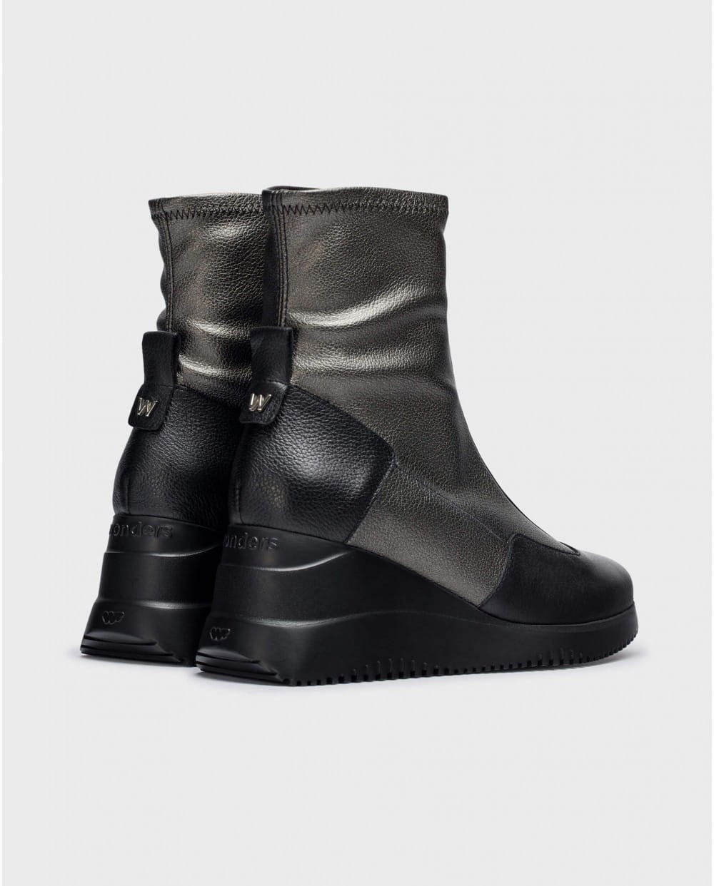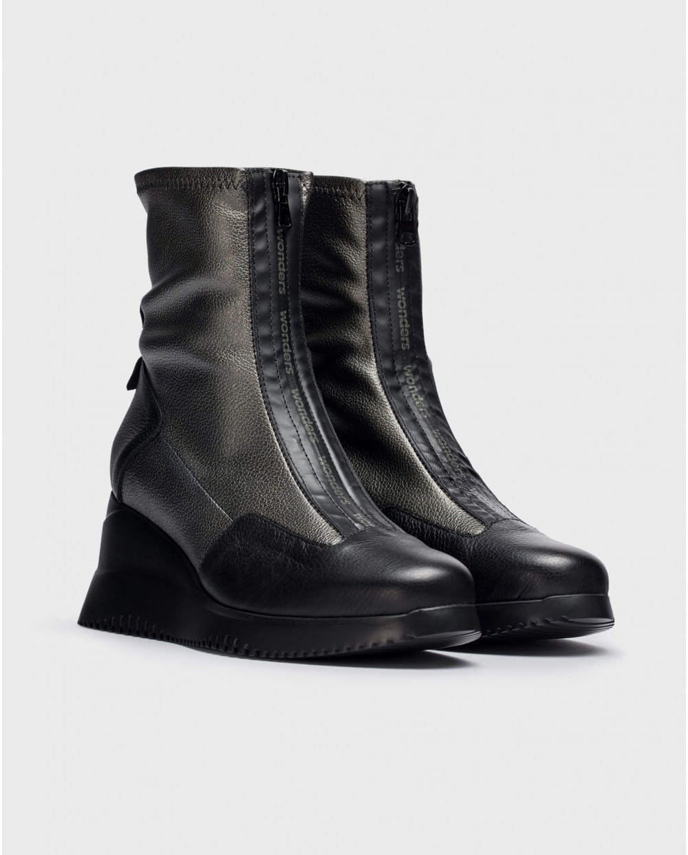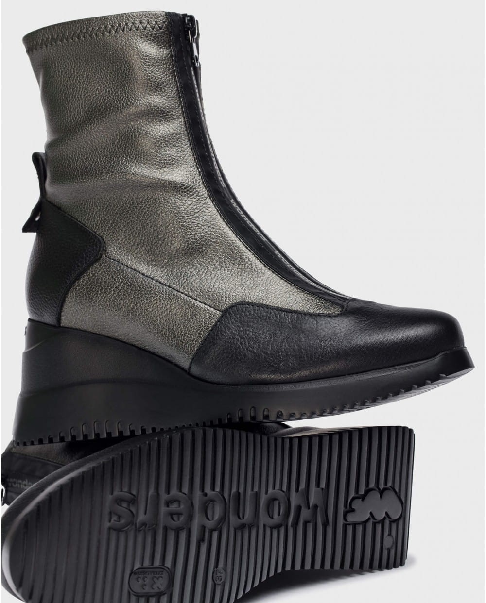 WONDERS INDIA-botki. Wyróżniają się oryginalnym designem, nawet wyrafinowaniem dzięki gumowanemu, nieprzepuszczającemu wilgoci zamkowi błyskawicznemu z przodu buta. Doskonała skóra znakomicie przylega do stopy i łydki. Elastyczna cholewka w kolorze czarno-srebrzystym idealnie łączy się z ciemniejszą zelówką o kształcie klina. Botki INDIA są eleganckie i stylowe. WONDERS to hiszpańska marka obuwnicza doskonale czująca modne trendy, zawsze zapewniająca wygodę dla stóp.