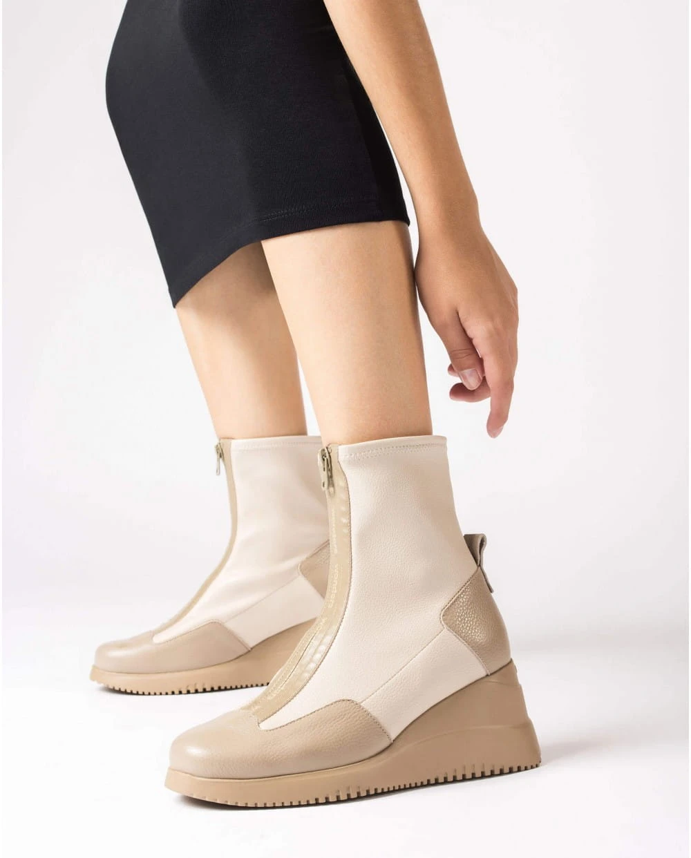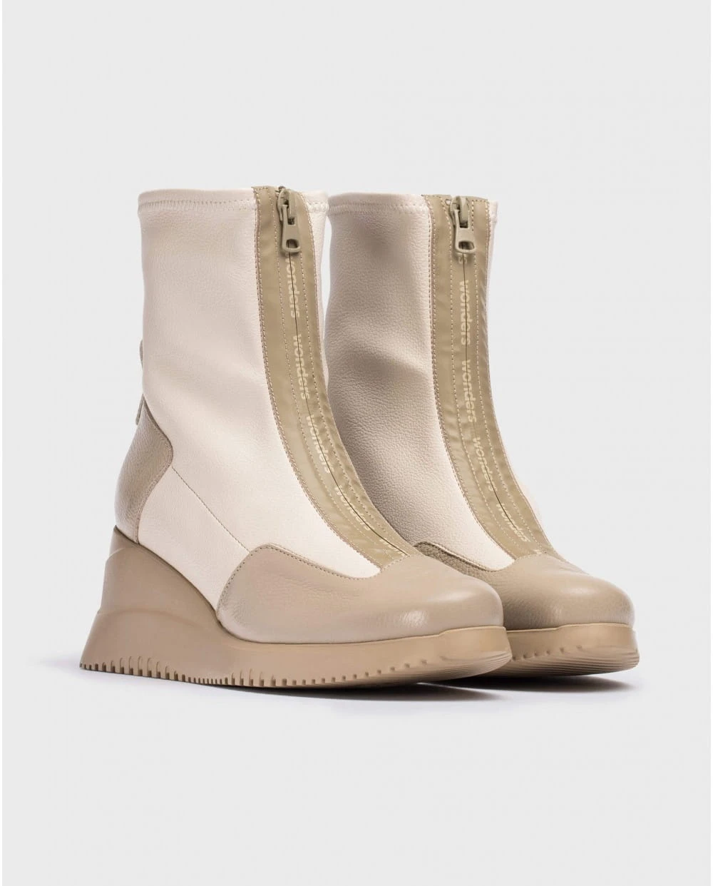 WONDERS INDIA-botki. Wyróżniają się oryginalnym designem, nawet wyrafinowaniem dzięki gumowanemu, nieprzepuszczającemu wilgoci zamkowi błyskawicznemu z przodu buta. Doskonała skóra znakomicie przylega do stopy i łydki. Elastyczna cholewka w kolorze beżowym idealnie łączy się z ciemniejszą zelówką o kształcie klina. Botki INDIA są eleganckie i stylowe. WONDERS to hiszpańska marka obuwnicza doskonale czująca modne trendy, zawsze zapewniająca wygodę dla stóp.